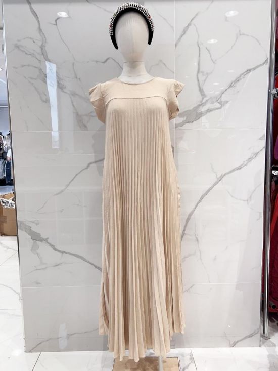 Robe longue plissée col rond manches courtes