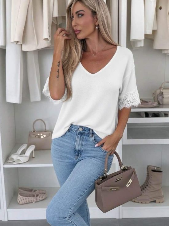 Pull fin col V manches courtes ornées de dentelle Luce-shop Collection.