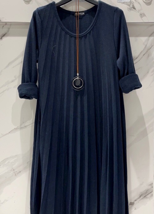 Robe en jersey plissé, décolleté arrond, manches longues, longueur midi et collier.