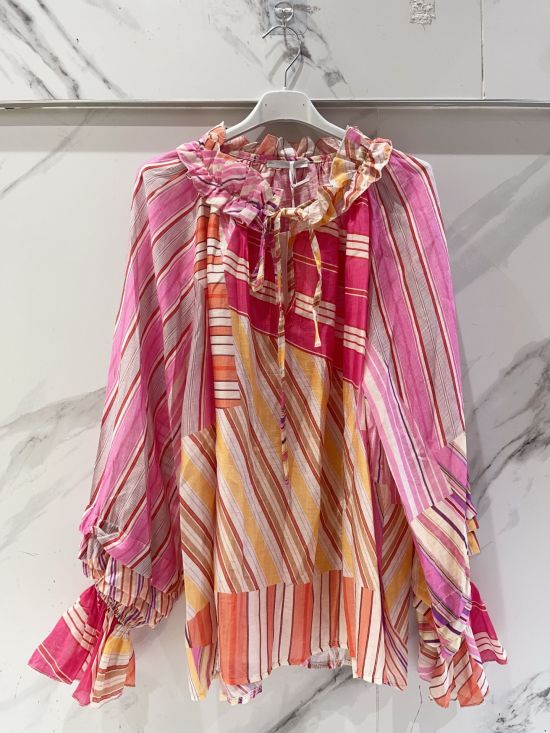 Blouse oversized col bouillonné jeu de rayures multicolores Miss Carla