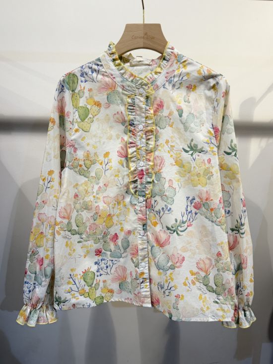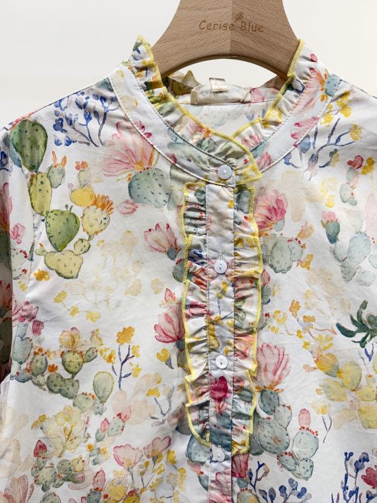 Chemise col bouillonné imprimé fleurs et cactus Cerise Blue.