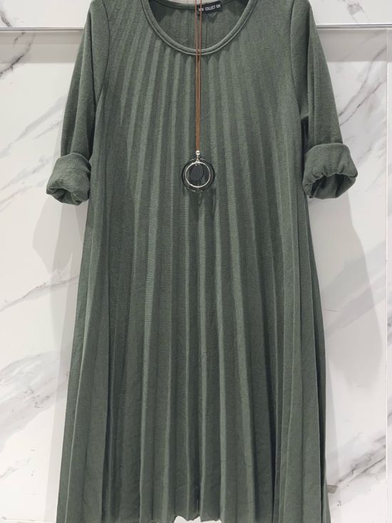 Robe en jersey plissé, décolleté arrond, manches longues, longueur midi et collier.