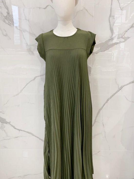Robe longue plissée col rond manches courtes
