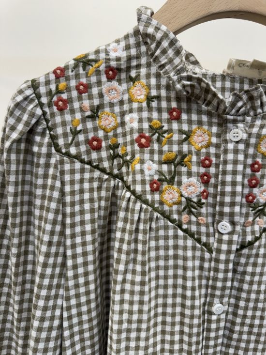 Chemise vichy col frou-frou plastron brodé de fleurs Cerise Blue.
