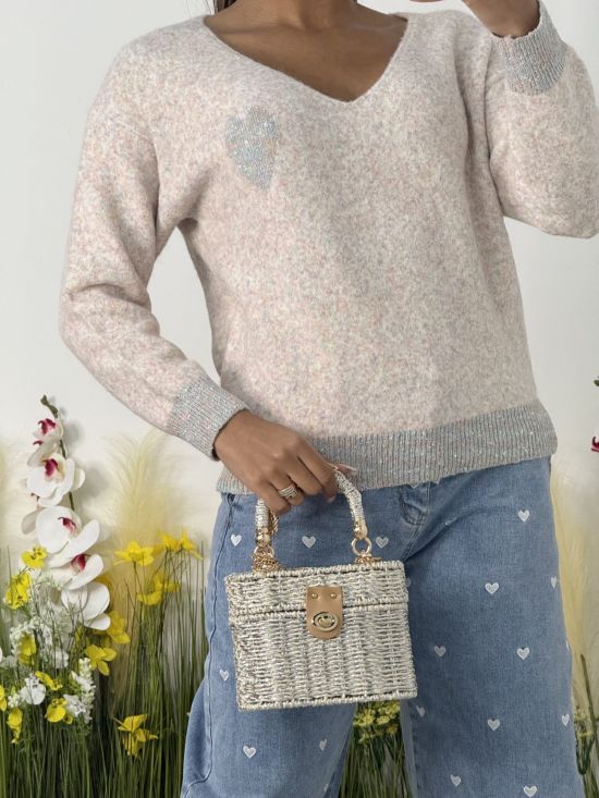 Pull en maille col V cœur poitrine Carla Giannini