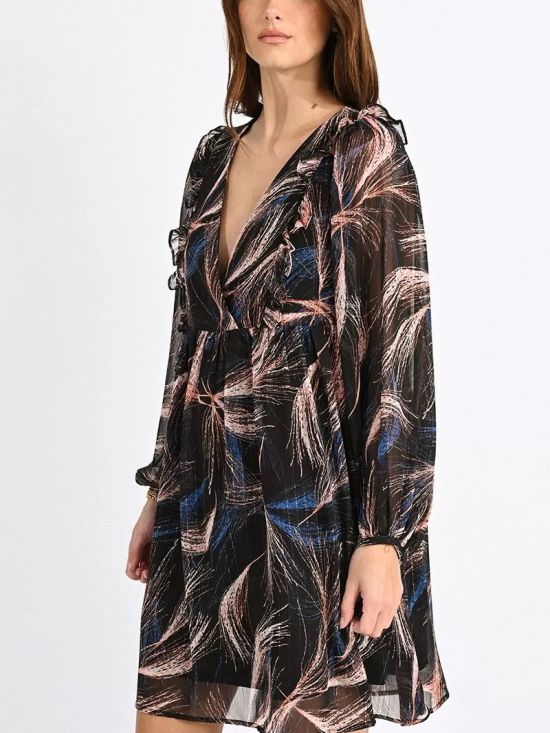 On aime le motif stylisé réhaussé de fils lurex de cette robe courte. Décolleté V avec bande volantée, manches longues bouffantes.