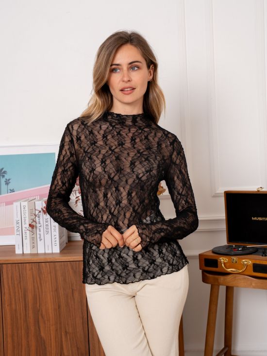 Top en dentelle à col montant manches longues Kilky