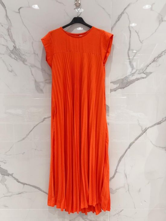 Robe longue plissée col rond manches courtes