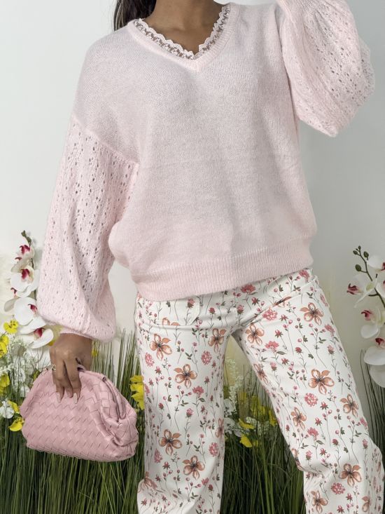 Pull en maille col V avec dentelle festonnée